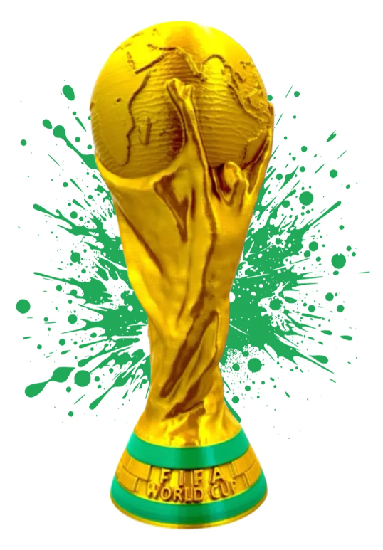 A taça apresenta dimensões e proporções inspiradas no troféu oficial da Copa do Mundo, com base na arte dourada e verde para dar autenticidade. É produzida para quem valoriza lembranças esportivas e itens colecionáveis. Suas linhas esculpidas trazem sensação de movimento e impacto visual marcante.